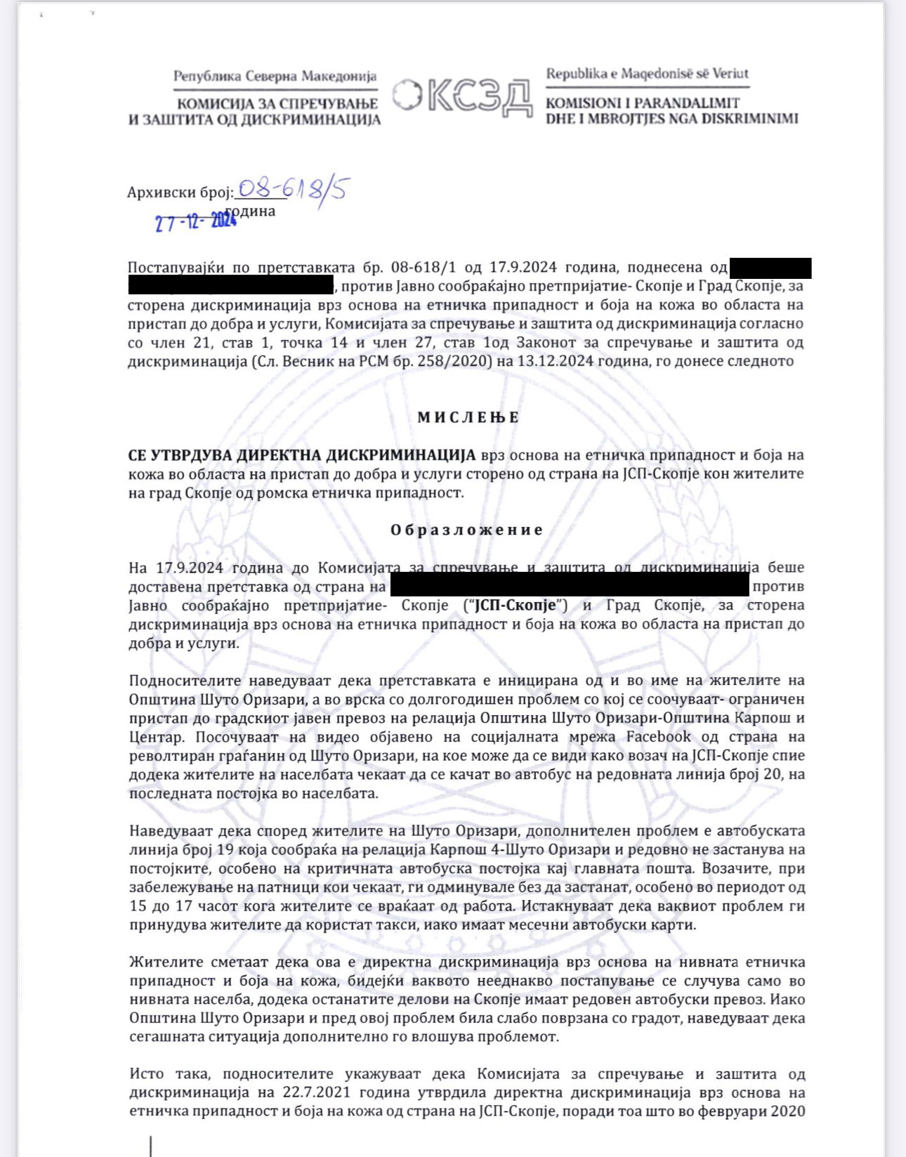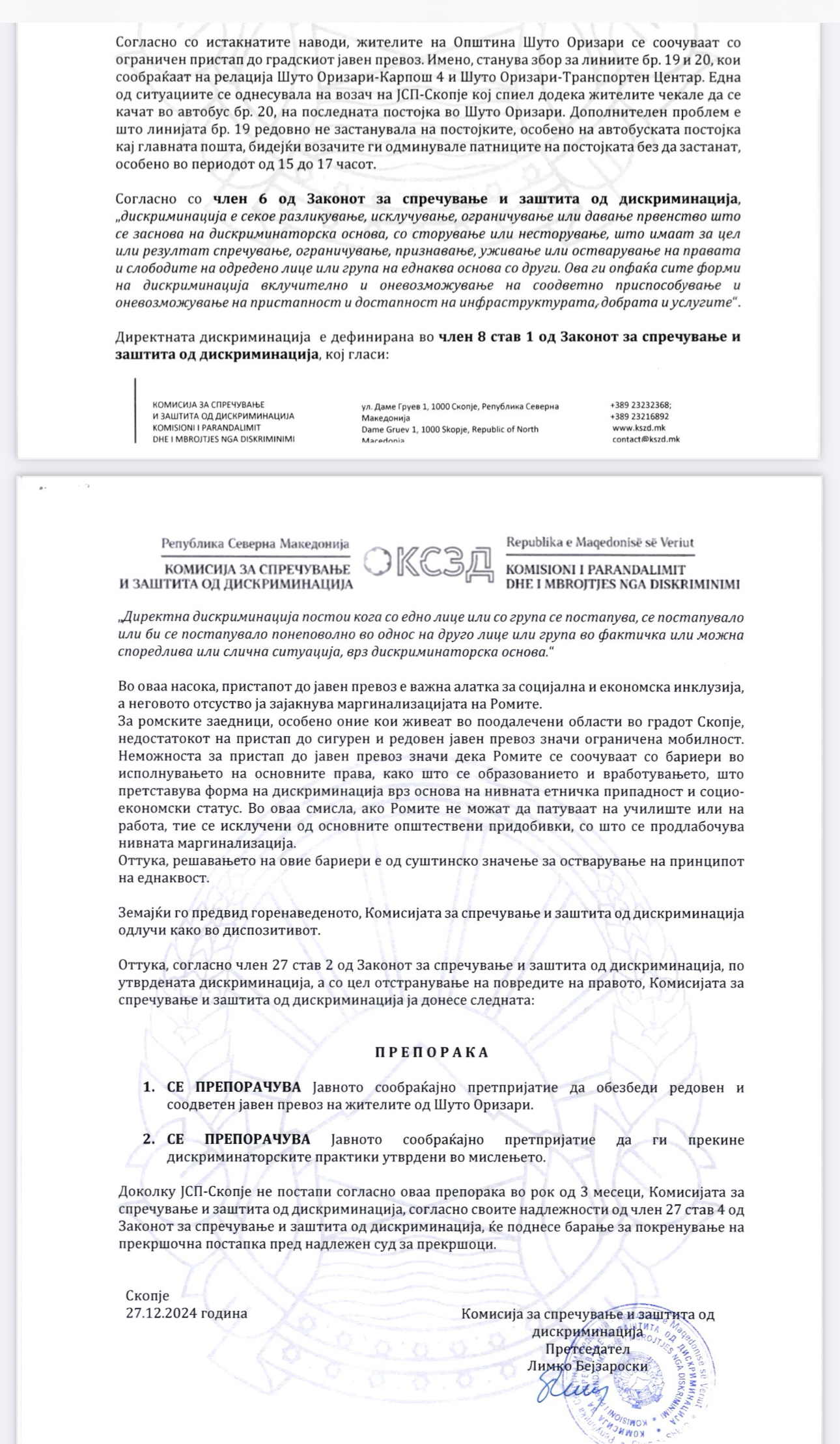 Јавното сообраќајно претпријатие (ЈСП Скопје) ги дискриминира Ромите од Шуто Оризари врз основа на етничка припадност и боја на кожата,укажа Комисијата за спречување и заштита од дискриминација. И на двете автобуски линии (со автобуси со број 19 и 20) што ја поврзуваат оваа населба со Центар и со Карпош 4, биле регистрирани чудни настани. Возачот од линијата број 20 спиел на последната постојка во населбата додека граѓаните чекале да се качат во автобус.